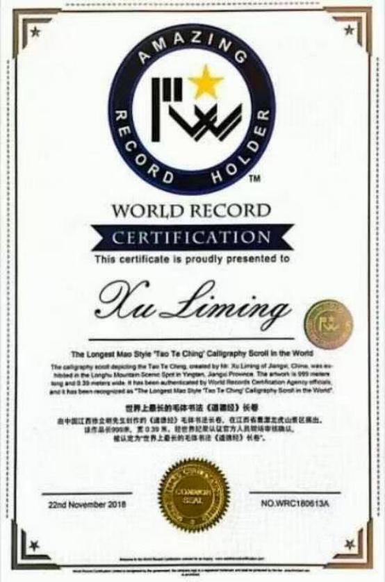 三是《毛主席诗词》长卷及《道德经》长卷荣获世界纪录唯一保持者。